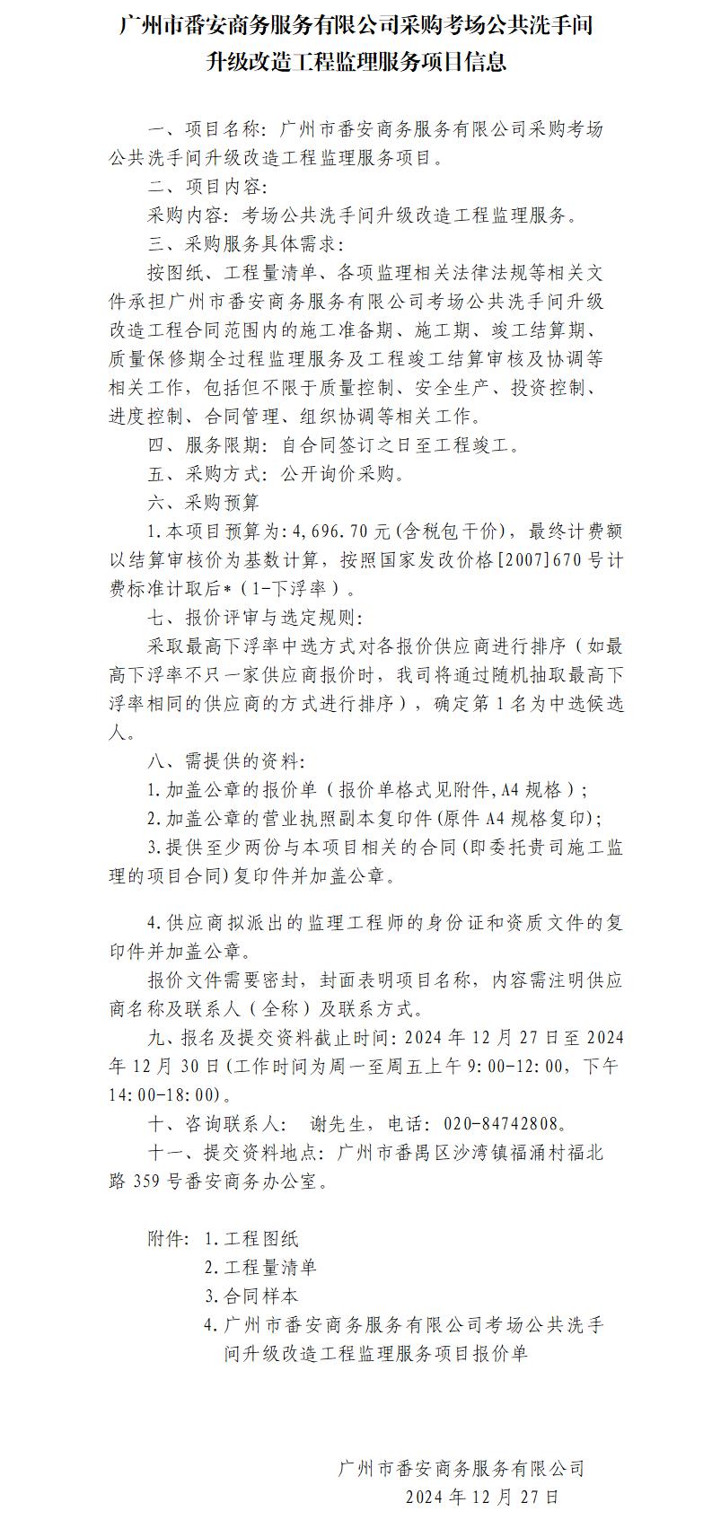 廣州市番安商務(wù)服務(wù)有限公司采購(gòu)考場(chǎng)公共洗手間升級(jí)改造工程監(jiān)理服務(wù)項(xiàng)目信息
