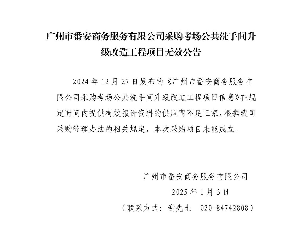 廣州市番安商務(wù)服務(wù)有限公司采購(gòu)考場(chǎng)公共洗手間升級(jí)改造工程項(xiàng)目無(wú)效公告